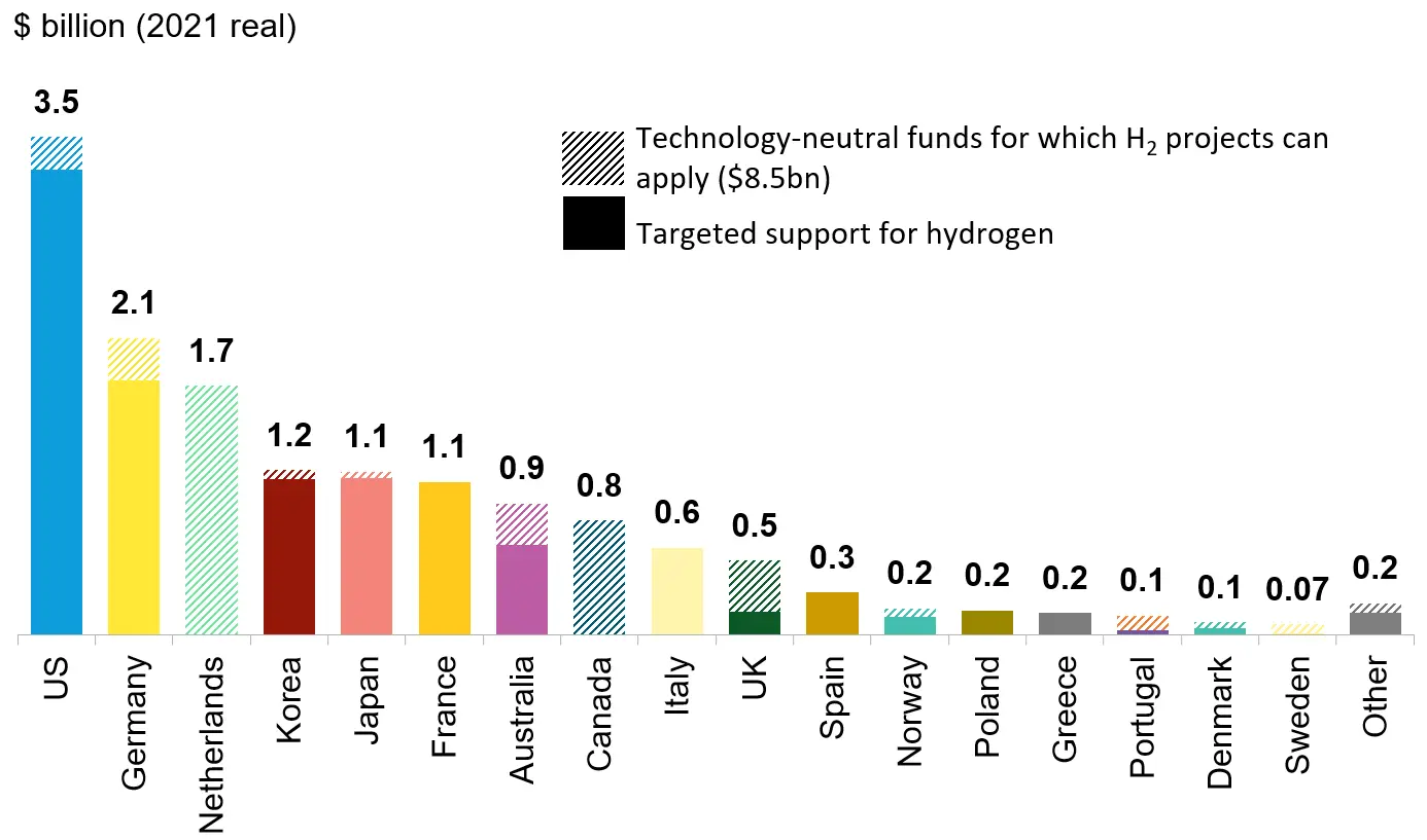 As well as supporting mature industries like solar, wind and electric vehicles, this stimulus is also focusing on new technologies such as carbon capture and hydrogen. Dominance in these industries is still up for grabs on the global stage and with these changes, it is hoped that the US can flourish in these nascent industries. In terms of Hydrogen technology, the US will now be a global leader in terms of public funding, as shown in this graph: