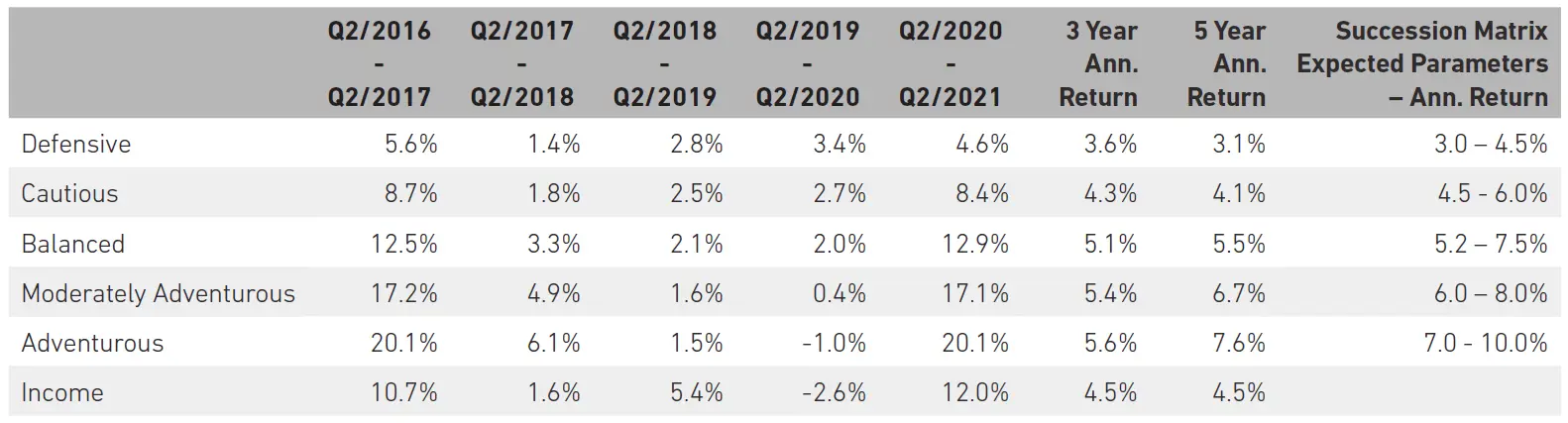 At 7IM, we believe that taking a long-term view is essential when investing. We can’t always avoid the short-term bumps and shocks that the financial world has in store, but a well-diversified portfolio goes a long way towards smoothing out some of the journey. The long-term nature of our strategic and tactical process is a good complement to the Succession Matrix Expected Parameters.